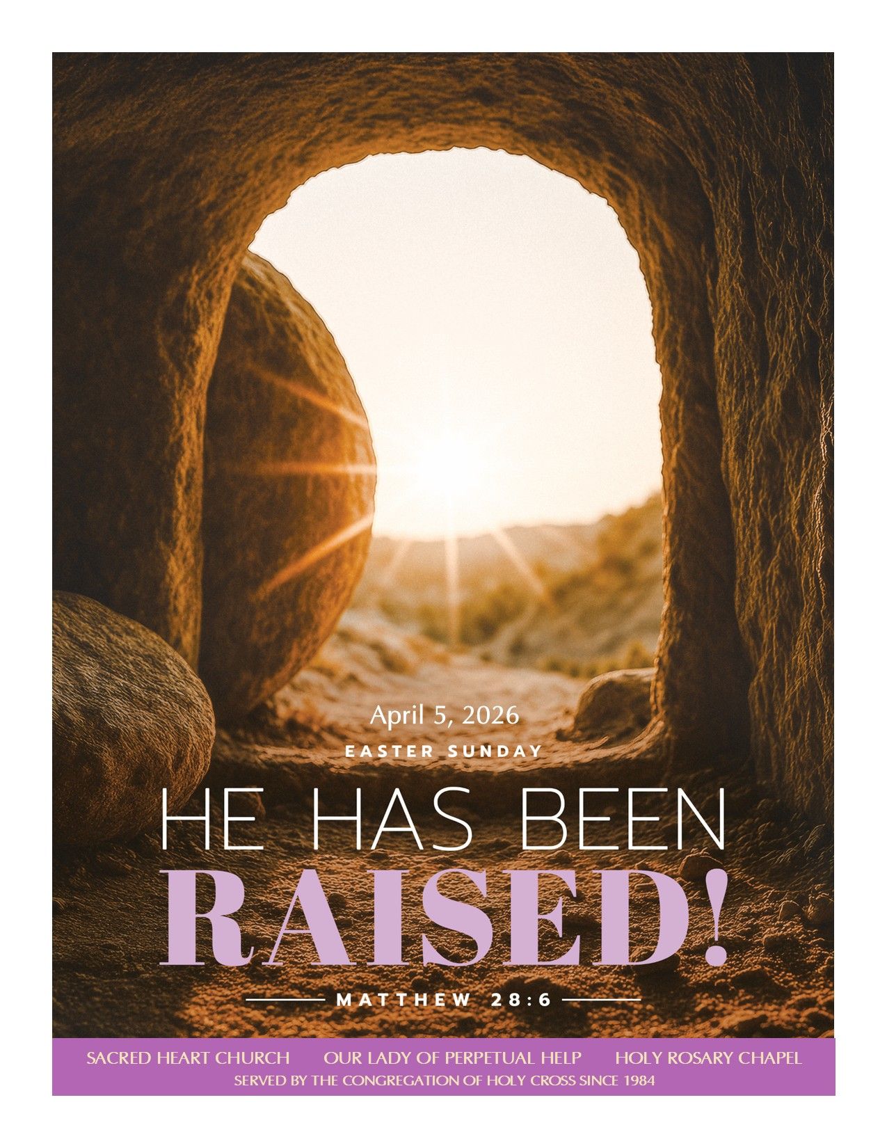 - Easter Sunday Masses: Sacred Heart Church- 7:30 am*, 9 am & 11:30 am; Holy Rosary Chapel- 9 am; OLPH- 5 pm.