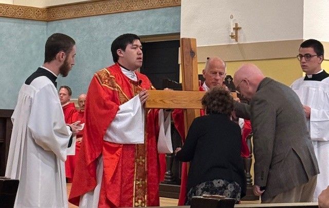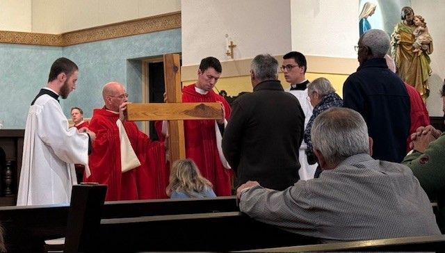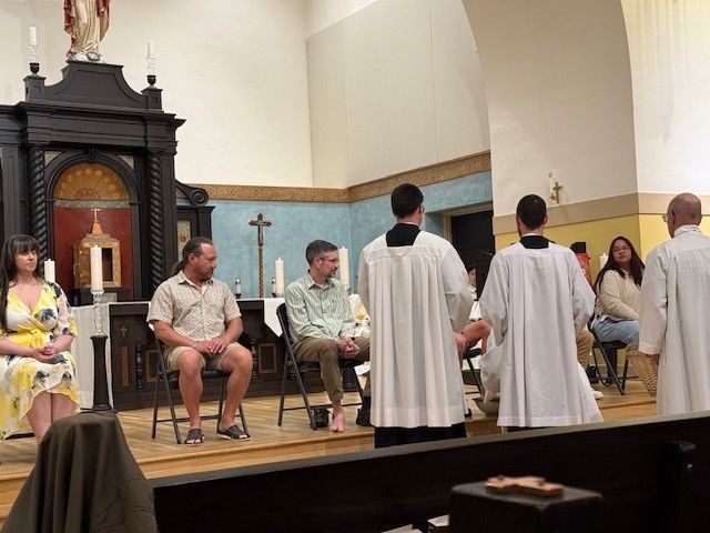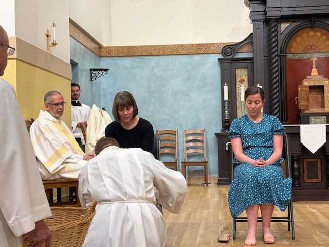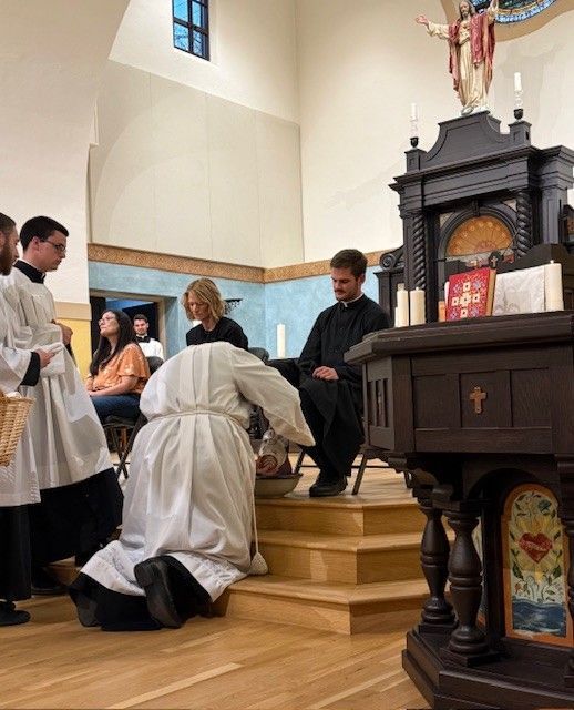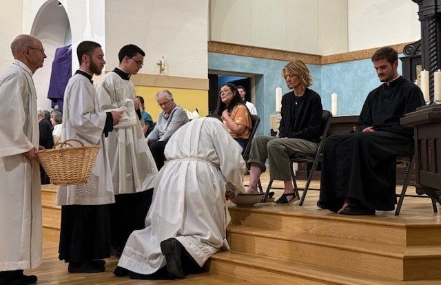 Fr. Jarrod Waugh, CSC washes the feet of parishioners on Holy Thursday, April 6, 2023.